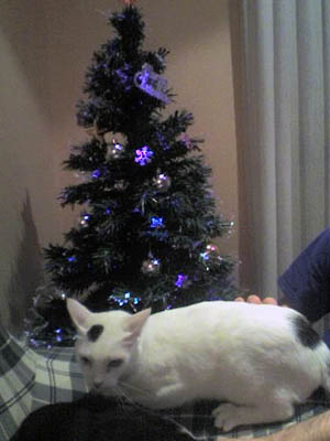 Mi gemelo es feliz, no sólo porque es Navidad, sino también porque le han puesto un árbol con divertidas luces de colores (¡qué entretenido!). En mi territorio no hay ninguna novedad… estos dos gatos gordos son más vagotes que yo, (y mira que es difícil).